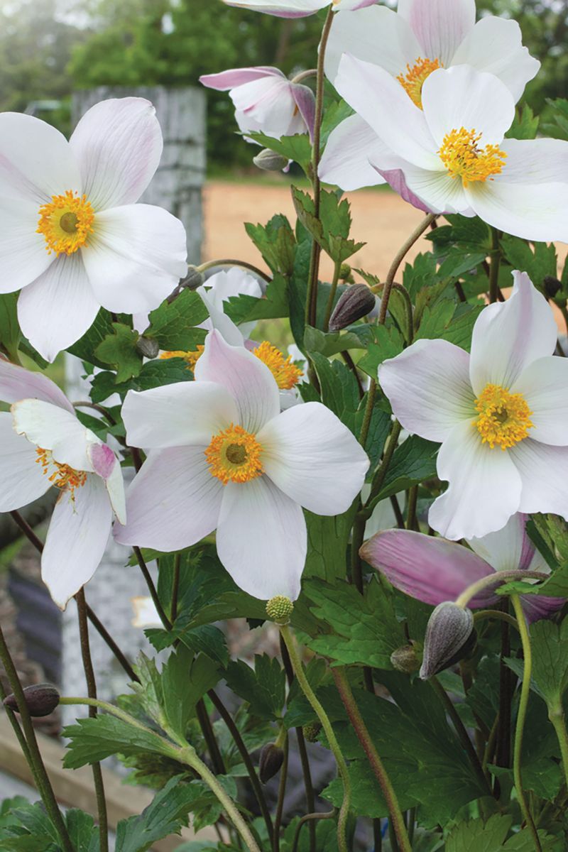 Compact variety of windflower. With white blooms with pink on reverse of petals.