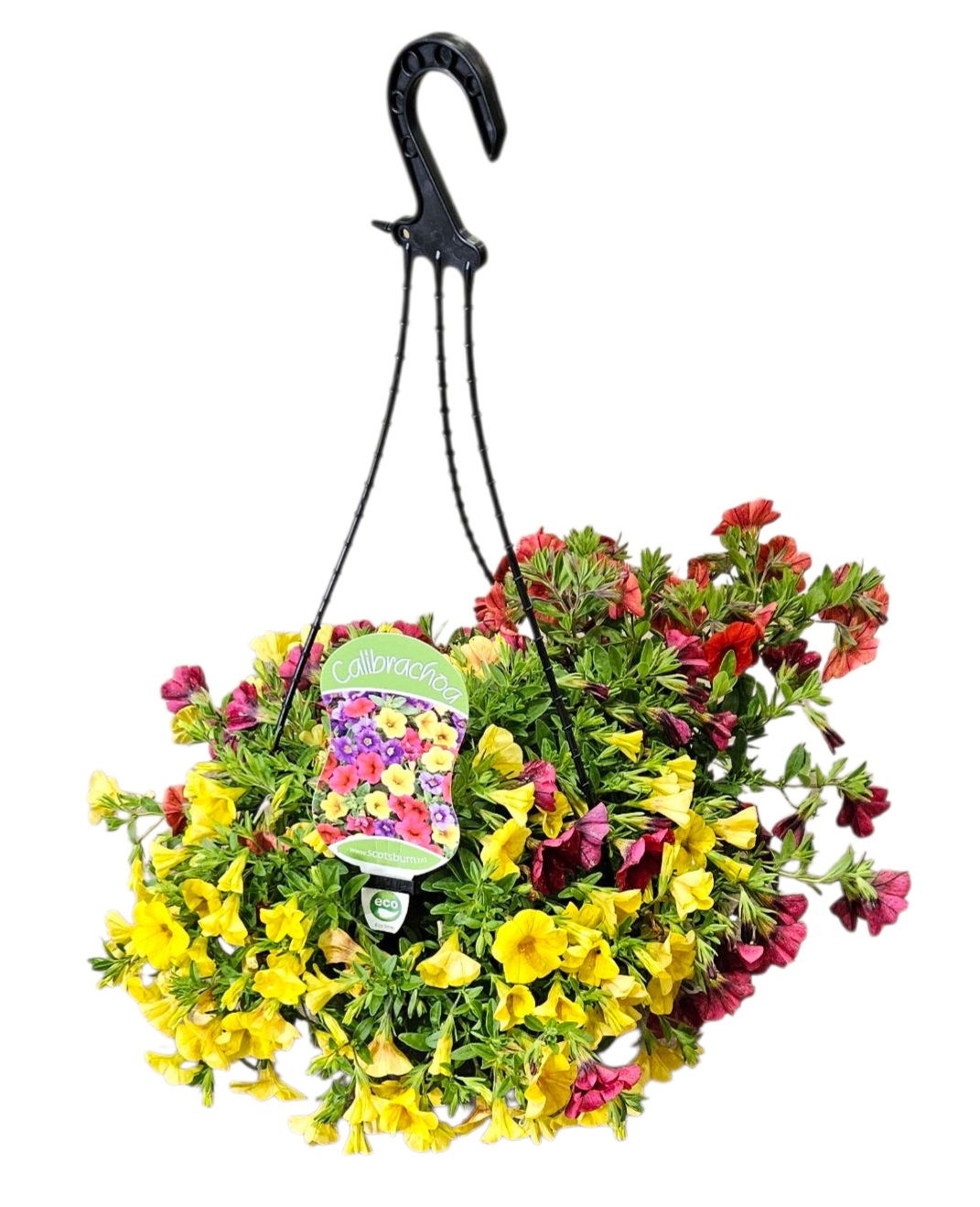 Multiplanted Calibrachoa basket in shades of orange, yellow and red.