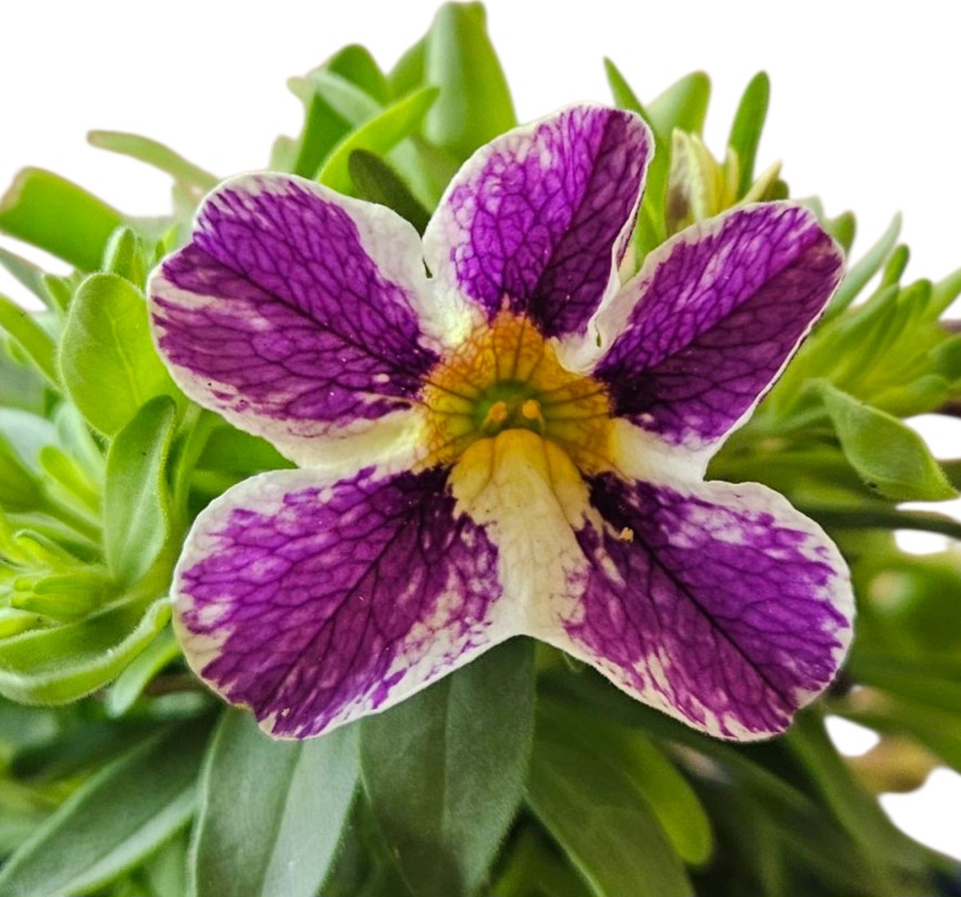 A beautiful Calibrachoa producing flowers with an unusual purple and white colour pattern from spring to autumn and has a perfectly mounding growth habit.