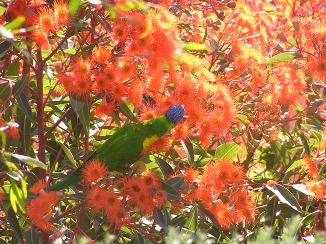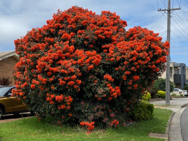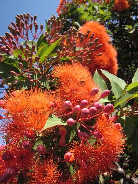 Corymbia ficifolia Dwarf Orange A grafted dwarf Eucalyptus with bright orange flowers growing 4m x 4m. Parrots and honey eaters love the nectar of the flowers occuring anytime from late Spring, Summer or Autumn.