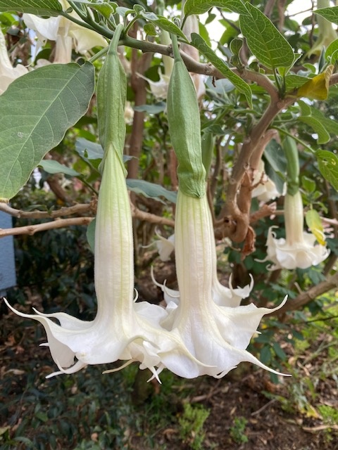 The Brugmansia ‘Double White’, commonly known as Angel’s Trumpet, is a striking flowering shrub or small tree admired for its large, pendulous double white blooms and strong evening fragrance. The layered trumpet flowers create a dramatic, elegant display through the warmer months.