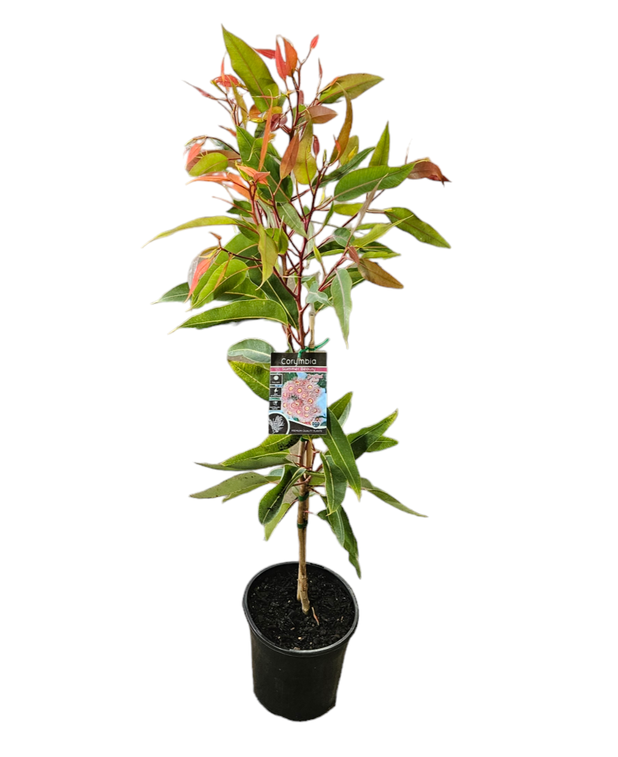 A spectacular small hybrid that is smothered in massed trusses of soft pink flowers in summer followed by ornate gumnuts.