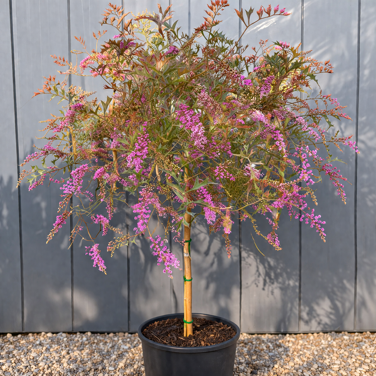 Flowering in pinky-purple spider-like blooms, this selection offers a softer, more contemporary colour palette while still attracting birds and pollinators. Its refined standard shape makes it ideal for feature planting, entrances, courtyards, and large decorative pots.