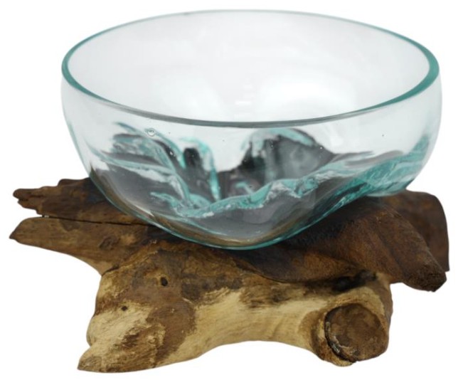 Hand Blown Glass Bowl On Driftwood 24x15cm quantity