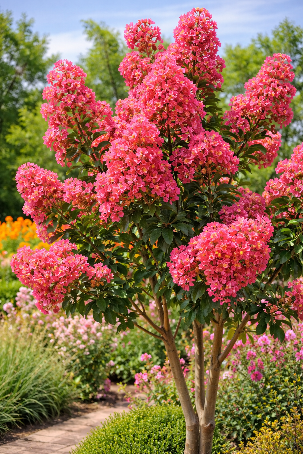 Buy Lagerstroemia ‘Tuscarora’ Crepe Myrtle in a 200mm pot. Vibrant pink summer flowers with stunning autumn colour. Grows approx. 6–8m high x 4–5m wide – ideal for Australian gardens.