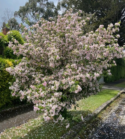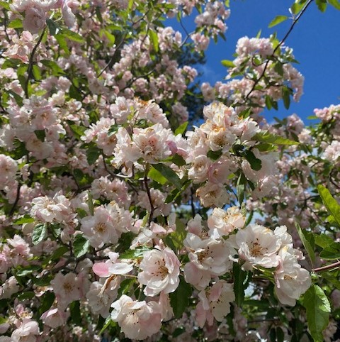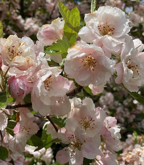 Masses of mildly fragrant, double flowers in groups of three to five in late spring. The outer petals of the buds are a soft, delicate pink and open to large, rose-like flowers with prominent yellow stamens. At full bloom the tree is a floral mass.