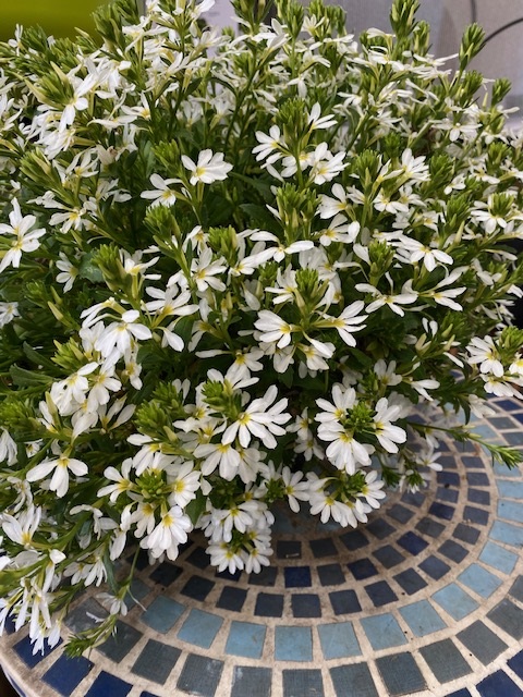 Performs well in baskets and containers, covered with clean white, fan-shaped flowers in summer